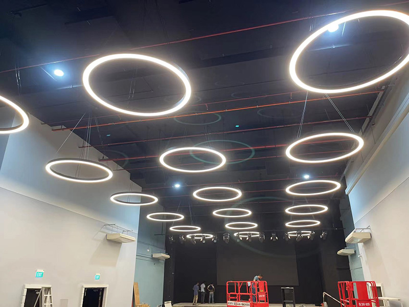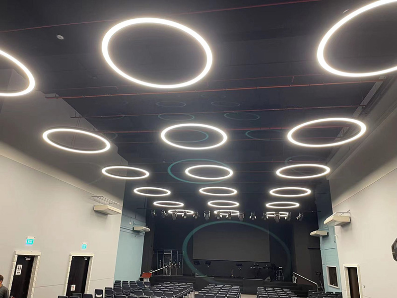 Customer finally choose 1.8meter diameter LED circular ring light to install at the public space of the church, with a total quantity of 18 lights. Each light is connected by 4 segments with seamless connection. After assembling, they are lighting continuously without any light leakage. LED ring chandelier looks like a halo, it is perfect for the occasion, Black aluminum shell suitable for black ceiling background, 3000 Kelvin warmwhite light makes people feeling warm as well. And Dali dimming function allowes customer to choose a suitable brightness when they need. Because of high ceiling, we also supply hanging steel cables at 6meters long, the lighting works well and the customer is satisfied.